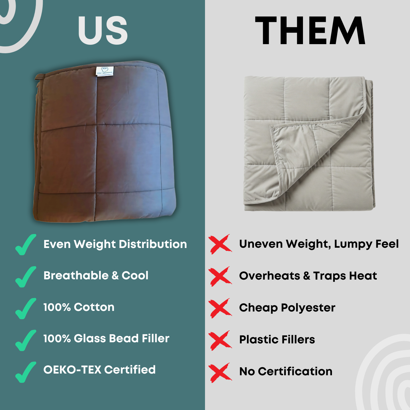 Our blanket is filled with 0.8-1mm non-toxic glass beads that are uniform in size and meet stringent health and safety requirements. This superior quality helps prevent shifting or leaking, ensuring consistent weight distribution for a better, more secure experience compared to many competitor products.